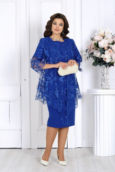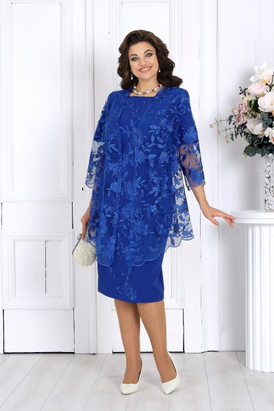 Платье женское, полуприлегающего силуэта, выполнено из костюмно-плательной ткани. Модель на подкладке, с плечевыми накладками. Перед с рельефными швами, направленными от горловины; центральная часть декорирована цветочной аппликацией, настроченной от горловины до низа. На спинке обработаны рельефные швы, направленные от горловины; в верхней части среднего шва спинки предусмотрена застежка на потайную тесьму-«молнию» (50 см), в нижней части – шлица. Вырез горловины округлый, углубленный по переду. Рукав короткий, втачной. Длина платья – 104 см, длина рукава – 25 см.