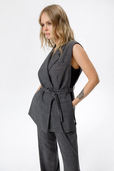 Детали: жилет прямого силуэта, талиевые вытачки переда и спинки, пиджачный воротник, застежка на пришивные кнопки, спинка со средним швом и шлицей, функциональные карманы, жилет на подкладке, в комплекте пояс из основной ткани и чёрный пояс-шнурок из кожзама. Брюки с высокой посадкой, притачной пояс со шлевками, передние половины с небольшими застроченными мягкими складками и заутюженными стрелками, застежка на молнию и пуговицу, боковые карманы. Задние части брюк с вытачками и заутюженными стрелками. Пояс брюк прямой, без резинки.