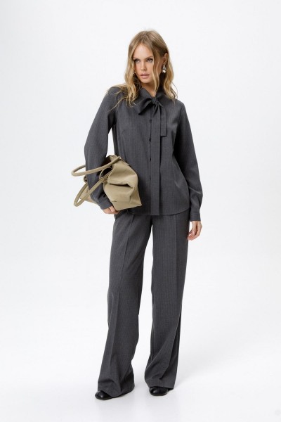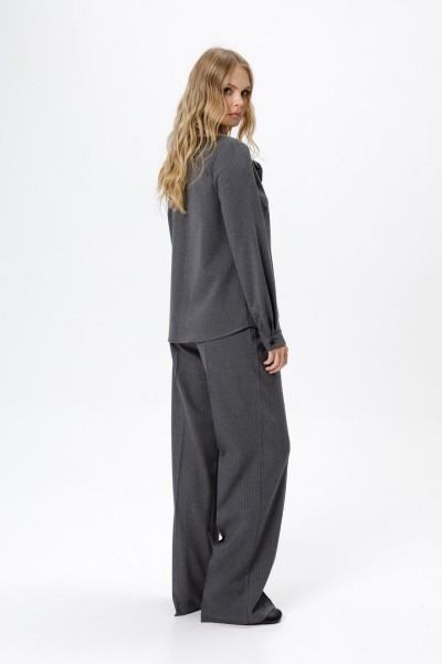 Детали: рубашка прямого силуэта, застежка на петли и пуговицы, длинные рукава с притачными манжетами. Брюки с высокой посадкой, притачной пояс со шлевками, передние половины с небольшими застроченными мягкими складками и заутюженными стрелками, застежка на молнию и пуговицу, боковые карманы.