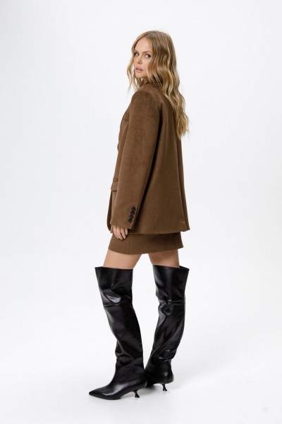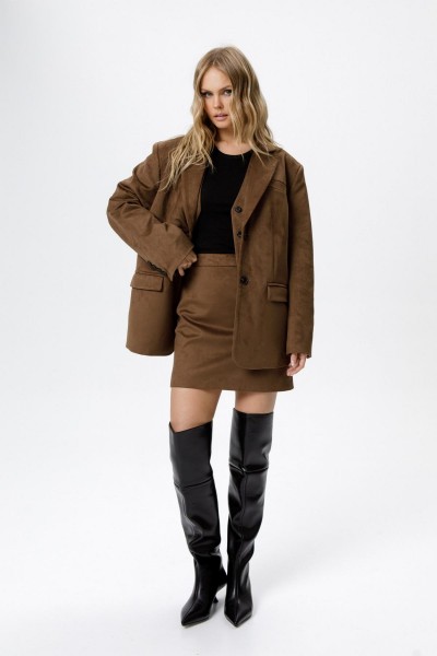 Костюм-двойка из оверсайз жакета и мини-юбки из ткани под замшу.