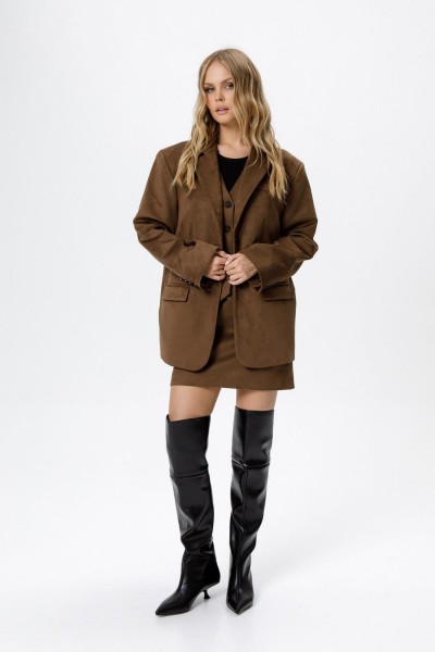 Костюм-тройка из оверсайз жакета, прямого жилета и мини-юбки из ткани под замшу.