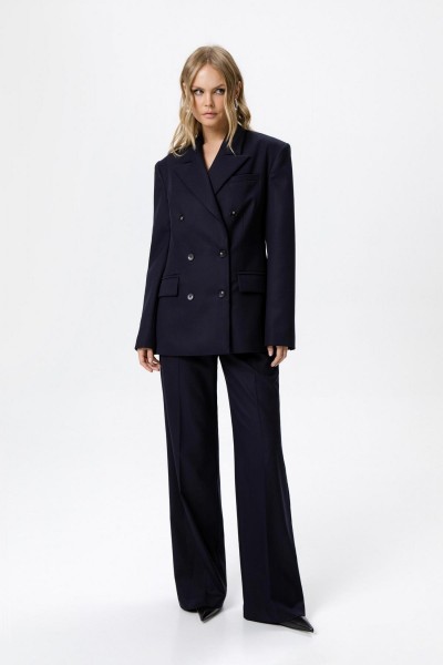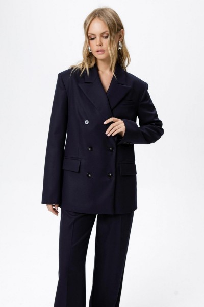 Детали: жакет свободного покроя и полуприлегающего силуэта, двубортная застежка на петли и пуговицы, отрезные бочки, пиджачный воротник, функциональные карманы, жакет на подкладке. Жилет полуприлегающего силуэта, талиевые вытачки, застежка на петли и пуговицы, функциональные карманы, фигурный низ, на подкладке. Брюки с высокой посадкой, притачной пояс со шлевками, передние половины с небольшими застроченными мягкими складками и заутюженными стрелками, застежка на молнию и пуговицу, боковые карманы. Задние части брюк с вытачками и заутюженными стрелками. Пояс брюк прямой, без резинки.