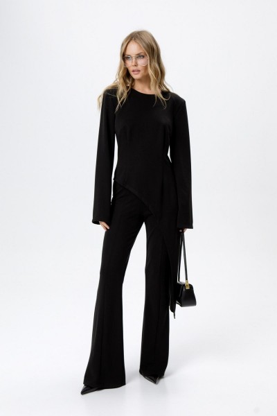 Трикотажный костюм-двойка из асимметричной туники и облегающих брюк-клеш.