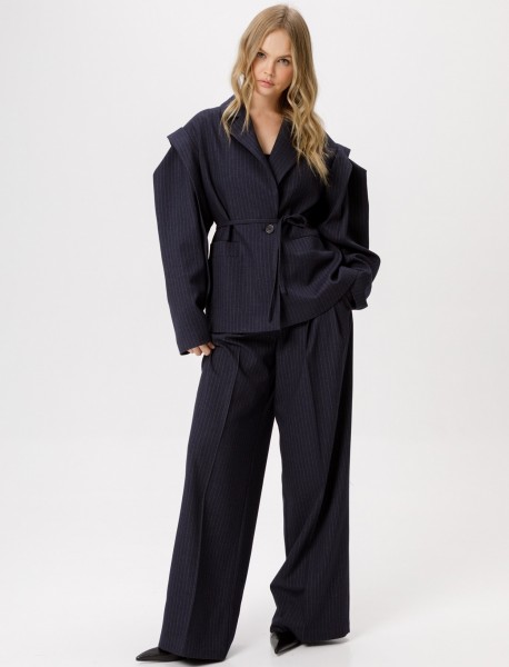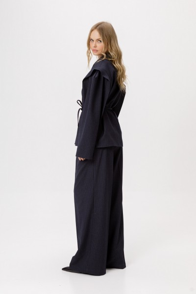 Костюм-двойка из оверсайз жакет со съёмным поясом и широких брюк-палаццо из текстильной ткани в полоску.
