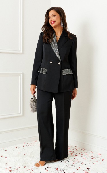 Воротник стояче-отложной пиджачного типа с лацканами. Правый лацкан выполнен из отделочной ткани с пайетками.