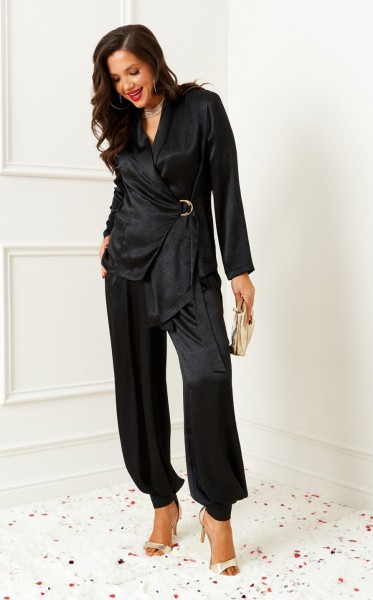 Костюм состоит из 2-х предметов одежды: жакета и брюк. Выполнен из атласной ткани стильного дизайна крэш.