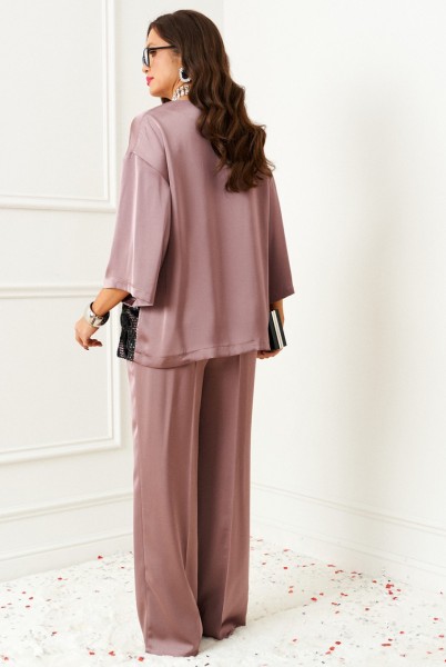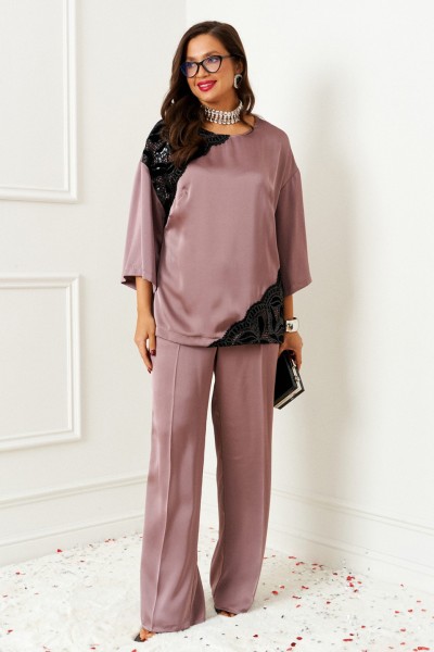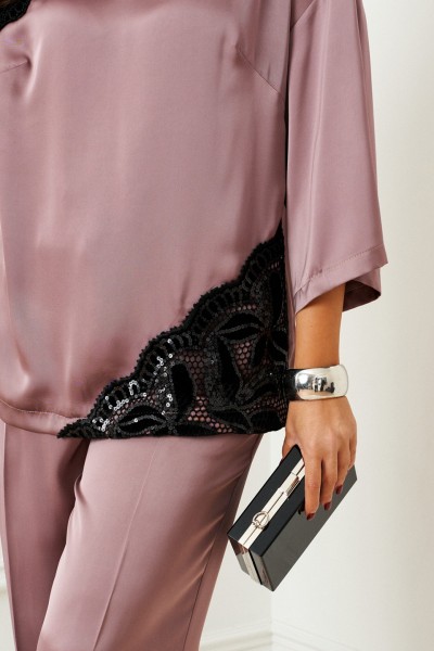 Изысканный костюм состоит из 2-ух предметов: блузки и брюк. Выполнен из атласного полотна в сочетании с кружевом. Основная ткань нежная, гладкой фактуры, приятная на ощупь и с блестящей поверхностью, она легко драпируется и очень выгодно и дорого подчёркивает образ; отделочная ткань придает праздничный шарм.