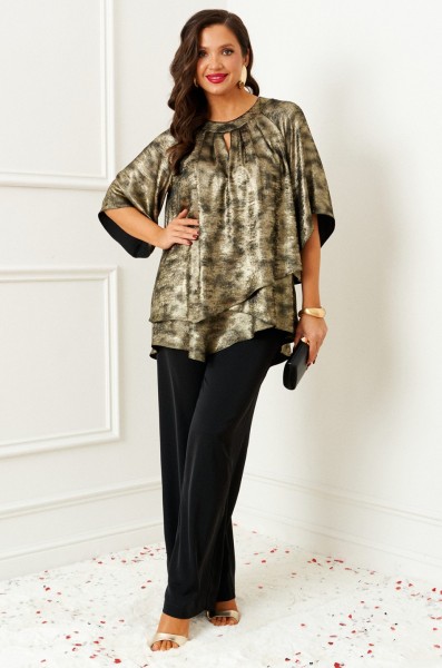 Изысканный костюм состоит из 2-ух предметов: блузки и брюк. Выполнен из эластичного полотна в сочетании с ворсовым шифоном. Брючная ткань нежная, гладко-бархатистой фактуры, приятная на ощупь, она легко драпируется и очень выгодно и дорого подчёркивает образ; блузочная ткань придает праздничный шарм.