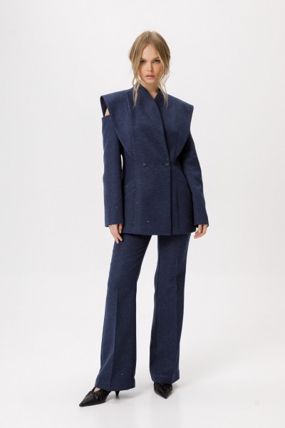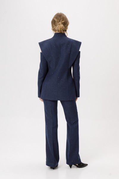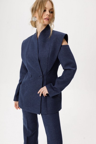 Детали: полуприлегающий силуэт, цельнокроеный воротник-стойка, двубортная застёжка на петли и пуговицы, рельефные швы переда и спинки с декоративным элементом, рукава длинные с вырезами по верху, функциональные карманы, жакет на подкладке. Брюки с притачным поясом со шлёвками, передние половинки с заутюженными стрелками, наклонные карманы, задние половинки с вытачками и заутюженными стрелками, застёжка на молнию и пуговицу с потайным крючком, пояс брюк прямой без резинки.