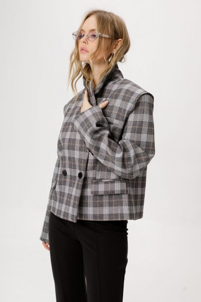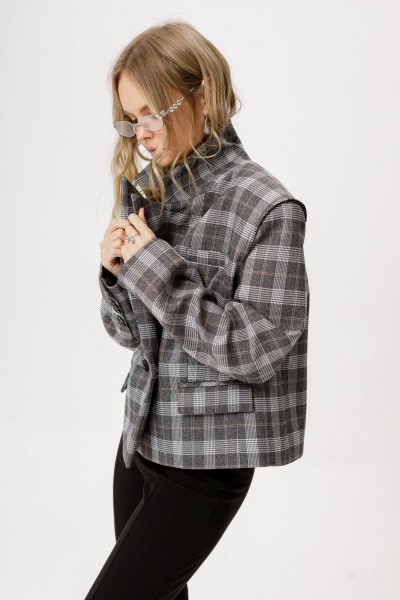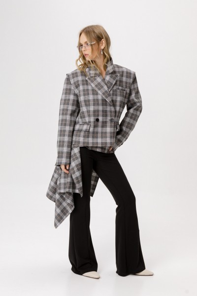 Комплект-двойка из укороченного оверсайз жакета в клетку с необработанными проймами и трикотажных облегающих брюк-клеш.