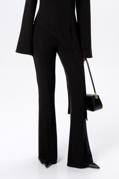Детали: жакет прямого силуэта, пиджачный воротник, двубортная застежка на две петли и пуговицы, функциональные карманы, спинка с фигурной кокеткой, рукава втачные, жакет на подкладке. Брюки с высокой посадкой, перед с рельефными швами, пояс с резинкой, брюки без карманов.
