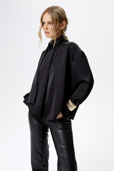 Комплект-двойка из свободной блузы со стойкой-бантом и прямых брюк из экокожи.