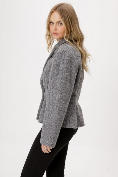 Комплект-двойка из приталенного жакета О-образного силуэта из утепленной фактурной ткани и трикотажных облегающих брюк-клеш.
