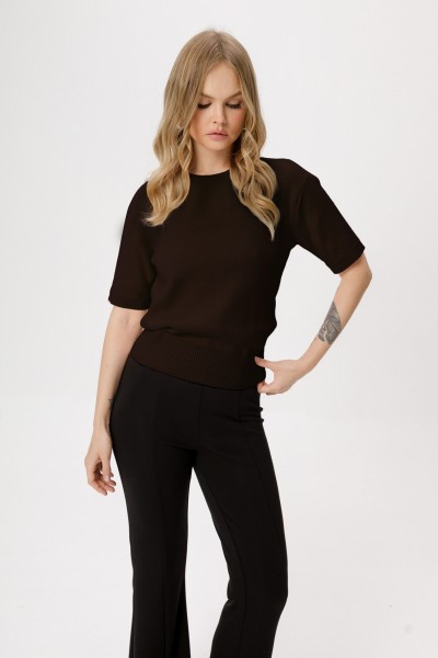 Детали: джемпер прямого силуэта с резинкой по низу, круглая грловина, рукава короткие. Брюки с высокой посадкой, перед с рельефными швами, пояс с резинкой, брюки без карманов.