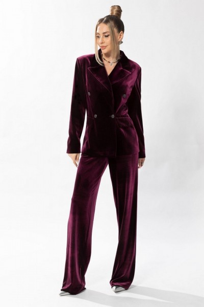 Жакет прямого силуэта с центральной двубортной застежкой на петли и пуговицы, с втачным воротником и отложными лацканами пиджачного типа. По переду с рельефами, выходящими из проймы. На уровне линии талии расположены настрочные клапаны. Спинка со средним швом, рельефами, выходящими из проймы. Рукав втачной, длинный. Брюки прямые, с отрезным поясом. По спинке и частично по переду пояс присборен на резинку.