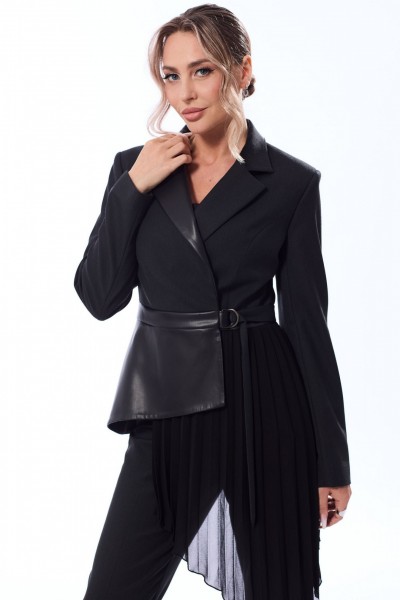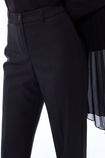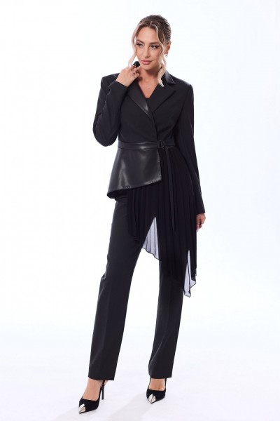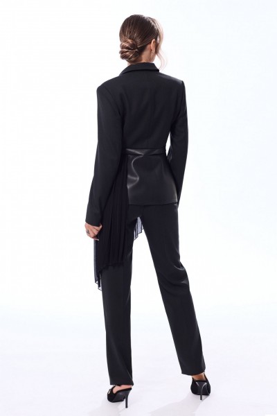 Жакет с центральной двубортной застежкой на пришивные кнопки, с втачным воротником и отложными лацканами. Отрезной по линии талии с втачным поясом. Баска с фигурной линией низа. Правая полочка зафиксирована поясом- завязкой с полукольцами. Левая полочка с отлетной деталью- гофре. Верхняя часть спинки со средним швом, рельефами, выходящими из проймы. Рукав втачной, длинный. Брюки с отрезным поясом, на поясе расположены шлевки. Застежка гульфик.