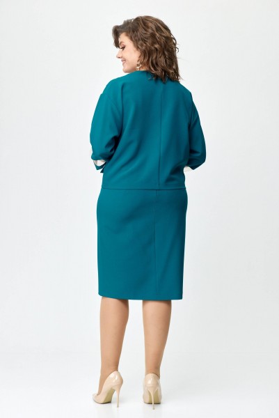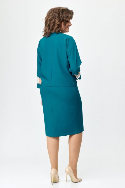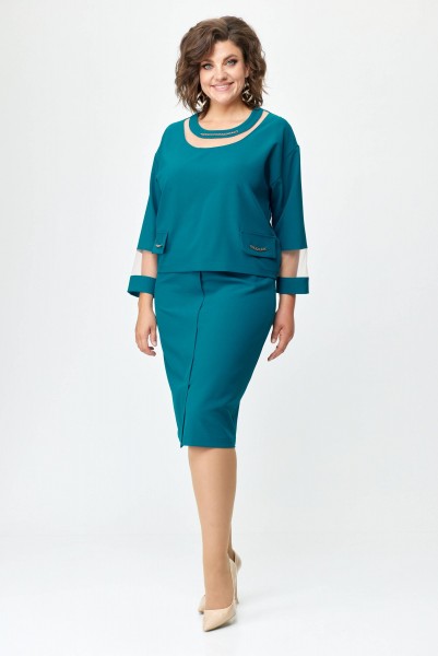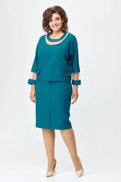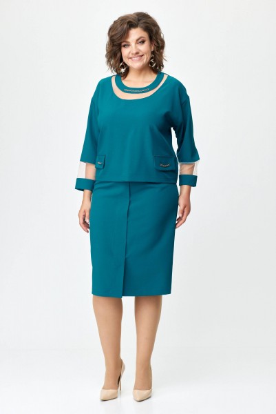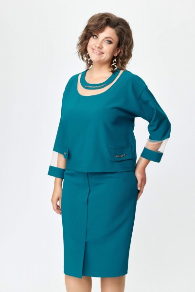 Элегантный женский костюм состоящий из блузы и юбки. Блуза свободного силуэта летучая мышь со спущенным рукавом. Горловина переда состоит из сетки и декоративной планки. Рукав заканчивается манжетой. По передней части костюма клапаны и горловина декорированы отделочной металлической цепочкой. Спинка со средним швом на обтачке. На заднем полотнище по центру потайная молния. На переднем цельнокроеная складка имитирующая планку заканчивающейся шлицей. Юбка на подкладке. Длина блузы 54 см, длина юбки 64 см.
