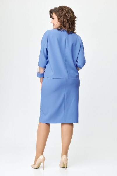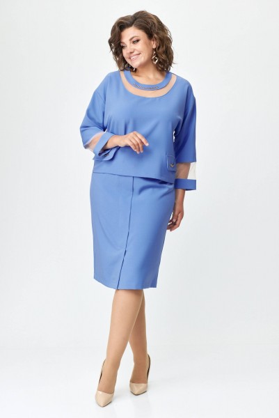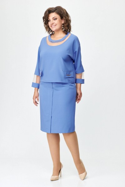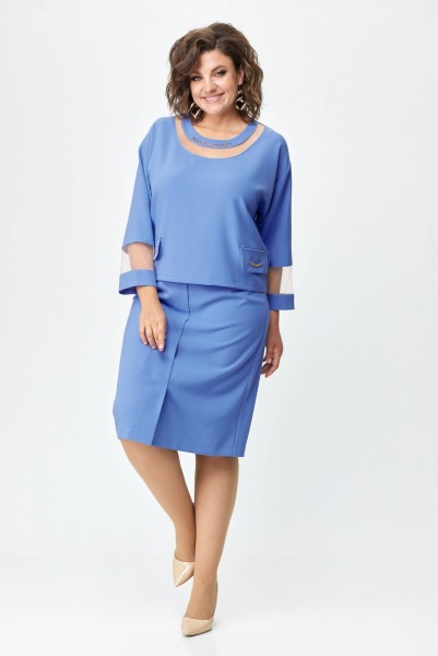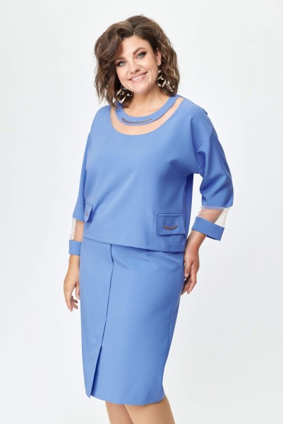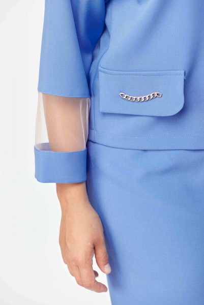 Элегантный женский костюм состоящий из блузы и юбки. Блуза свободного силуэта летучая мышь со спущенным рукавом. Горловина переда состоит из сетки и декоративной планки. Рукав заканчивается манжетой. По передней части костюма клапаны и горловина декорированы отделочной металлической цепочкой. Спинка со средним швом на обтачке. На заднем полотнище по центру потайная молния. На переднем цельнокроеная складка имитирующая планку заканчивающейся шлицей. Юбка на подкладке. Длина блузы 54 см, длина юбки 64 см.