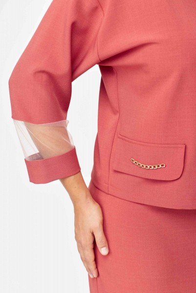 Элегантный женский костюм состоящий из блузы и юбки. Блуза свободного силуэта летучая мышь со спущенным рукавом. Горловина переда состоит из сетки и декоративной планки. Рукав заканчивается манжетой. По передней части костюма клапаны и горловина декорированы отделочной металлической цепочкой. Спинка со средним швом на обтачке. На заднем полотнище по центру потайная молния. На переднем цельнокроеная складка имитирующая планку заканчивающейся шлицей. Юбка на подкладке. Длина блузы 54 см, длина юбки 64 см.