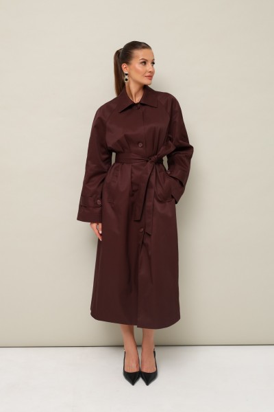 Плащ в длине миди, выполнен из ткани с водоотталкивающей и грязеотталкивающей обработкой. Силуэт слегка расширенный к низу. Отложной воротник с цельнокроеной стойкой. Центральная застёжка на петли и пуговицы. Спереди функциональные карманы-листочки. Рукава кроя реглан, по низу обработаны паты с застежкой на пуговицы. Спинка со средним швом со шлицей по низу. Плащ на подкладке. В комплекте прилагается пояс из основной ткани.