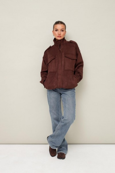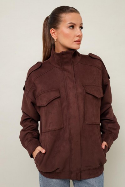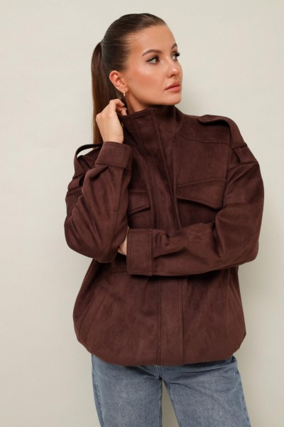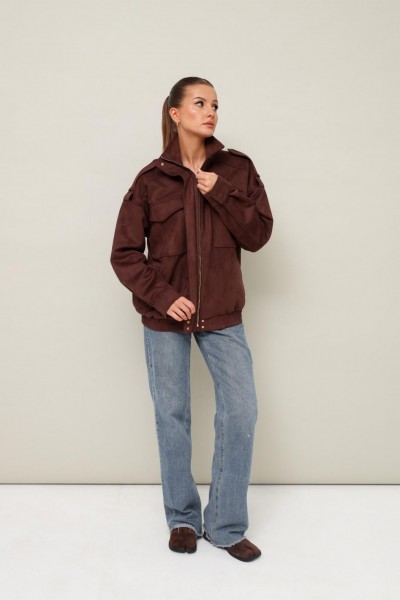 Бомбер актуального прямого кроя, выполнена из качественной экозамши. Воротник-стойка, центральная застёжка на молнию с притачной планкой. По плечевым швам паты. Спереди обработаны нагрудные накладные карманы с клапанами и прорезные карманы с листочкой. Рукава со спущенной линией втачивания плеча, по низу манжеты. Низ бомбера на резинке. Паты, центральная притачная планка и манжеты с застежкой на потайные кнопки. Спинка с кокеткой и средним швом. Бомбер на подкладке.