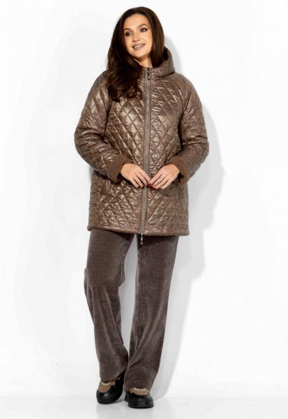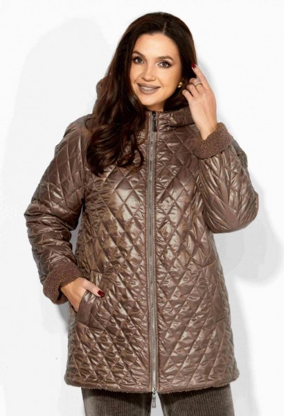 Куртка женская, демисезонная. Верх куртки - плащевка, стеганная на синтепоне. Подкладка - экомех "барашек". Куртка прямого силуэта с длинным рукавом "реглан". Длина рукава может регулироваться отворотом. По переду центральная застежка на "молнию" и прорезные, функциональные карманы. Горловина оформлена капюшоном-стойкой по переду.