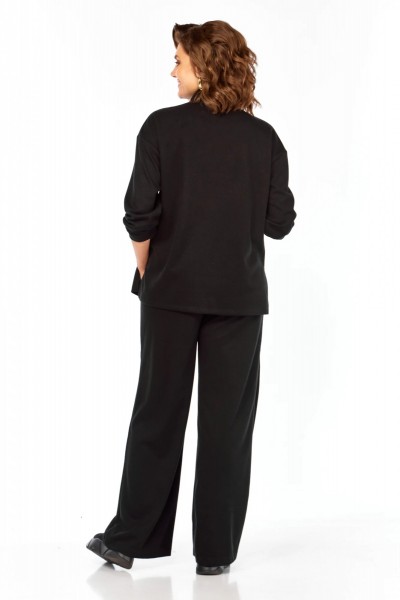 Комплект брючный состоит из кофты, жилетки и брюк. Кофта полуприлегающего силуэта со спущенным плечом, рукав втачной, одношовный. Воротник стойка с застежкой на тесьму-молнию. По боковым швам разрезы. Брюки расширенные книзу, верхний срез обработан поясом с резинкой. В боковых швах карманы. Жилетка свободного кроя со смещенной застежкой на петлю и пуговицу. По спинке горизонтальный рельефный шов на перед, в котором обработаны карманы. Цельнокроенный капюшон с центральной частью. В качестве отделки используется фурнитура.