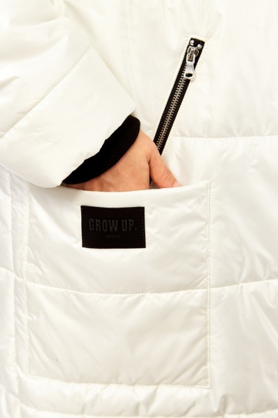 Пальто женское утепленное свободного кроя с ассиметричной застежкой на "молнию". Перед с прорезными карманами с "молнией" и накладными карманами. Правый накладной карман с отделочной нашивкой. Рукав втачной одношовный с трикотажным манжетом выходящим из-под подгибки. Объмный капюшон выполнен из 2-ух видов ткани. Утеплитель Hoopon 200, температурный режим до -10 градусов. Длина по спинке 107, длина рукава 61+5 см.