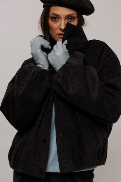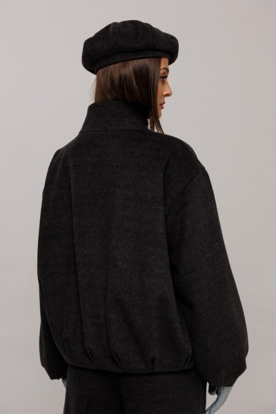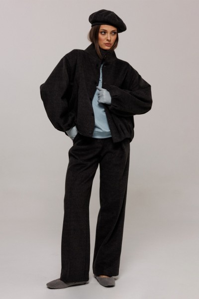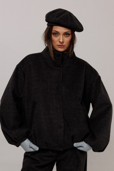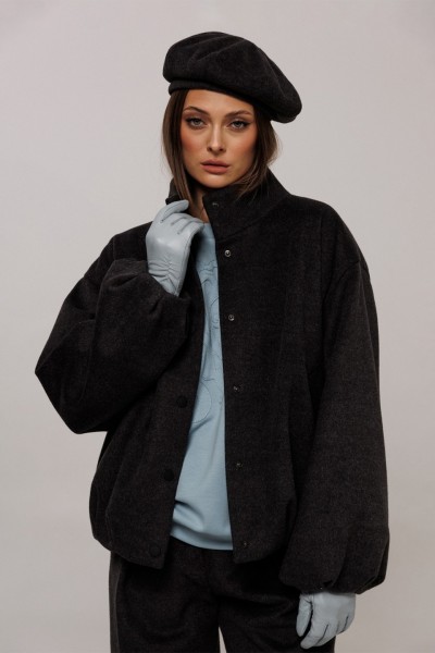 Элегантная куртка классического темно-серого цвета, выполненная из высококачественной пальтовой ткани. Дизайн куртки отличают широкие рукава с оригинальными складками у манжет, добавляющие изысканности образу. Прямой силуэт с немного спущенной линией плеч делает акцент на расслабленной посадке, подчеркивая современный стиль. Модель оборудована удобным центральным застежкой на кнопки и стильным воротником-стойкой, также с застежкой на кнопку. Функциональность куртки дополняют карман-листочка на полочке и подкладка. Дополнительные складки на низу полочки и спинки создают интересный объемный силуэт. Эта куртка станет идеальным выбором для создания уникальных и стильных образов в холодное время года.