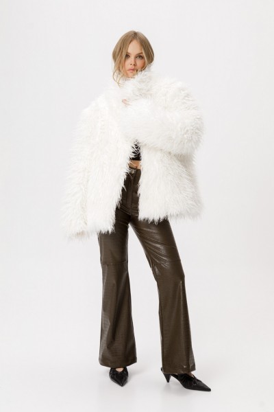 Шуба свободного покроя из длинноворсового меха под ламу.
