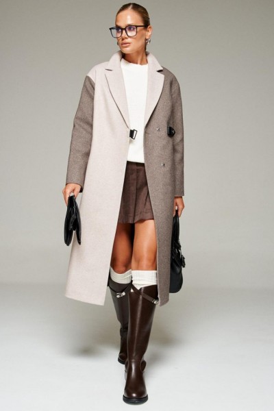 Пальто в актуальном сочетании меланжевых оттенков выполнено из шерстяной ткани, которая обеспечивает теплоизоляцию и защиту от ветра и влаги, подходит для межсезонья и теплой зимы. Двубортное, на подкладке. Изделие рассчитано на температурный режим от +10 до -5 градусов. Модель прямого силуэта с удлиненной линией плеча, предназначена для повседневного использования.