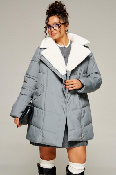 Воротник пиджачного типа с возможностью застегивания до верха. Внутренняя часть воротника и лацканы обработаны искусственным мехом.