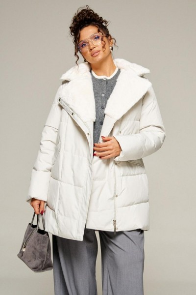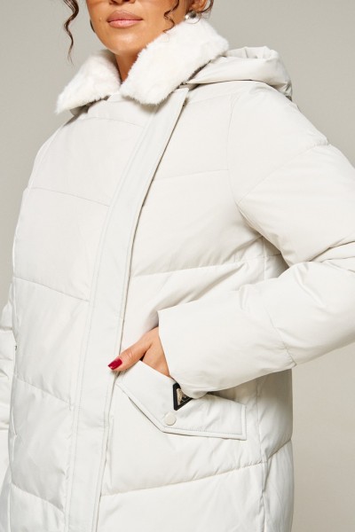 Воротник пиджачного типа с возможностью застегивания до верха. Внутренняя часть воротника и лацканы обработаны искусственным мехом.