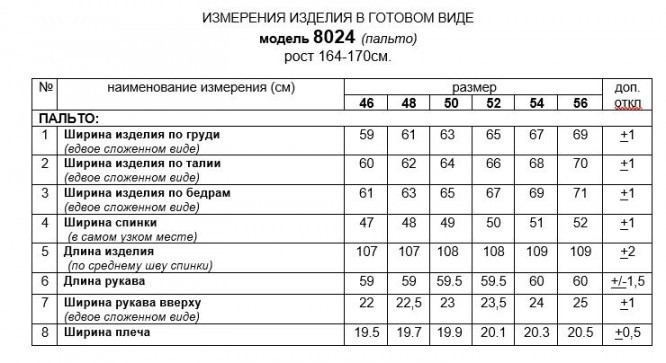 таблица размеров